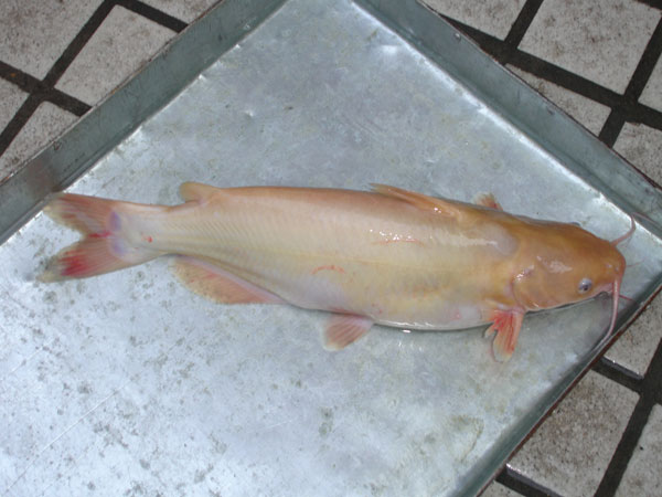 斑點叉尾鮰體型較長,體前部寬于后部,頭較小,吻稍尖,口亞端位,體表光滑無鱗,粘液豐富,側(cè)線完全,皮膚上有明顯的側(cè)線孔。頭部上下頜具有深灰色觸須4對,其中鼻須1對,頜須1對,頤須2對,長短各異,以頜須為最長,末端超過胸鰭基部,鼻須最短。鰓孔較大,鰓膜不連于峽部,頤部有較明顯而不規(guī)則的斑點,體重大于0.5公斤的個體斑點消失。具有脂鰭一個,尾鰭分叉較深,各鰭均為深灰色。體兩側(cè)背部淡灰色,腹部乳白色,幼魚體兩側(cè)有明顯而不規(guī)則的斑點,成魚斑點逐步不明顯或消失。